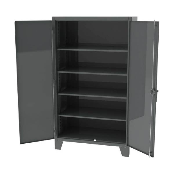 All Welded Storage Cabinet – 12ga Steel – Double Door – (4) 14 Gauge Adjustable Shelves – All Welded Door Hinges – 3 Point Door Lock with Heavy Duty Steel Padlocking Handle – 6” High Legs – 1500lb Capacity Shelves.